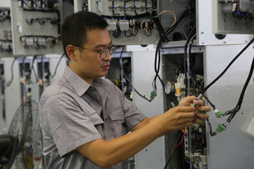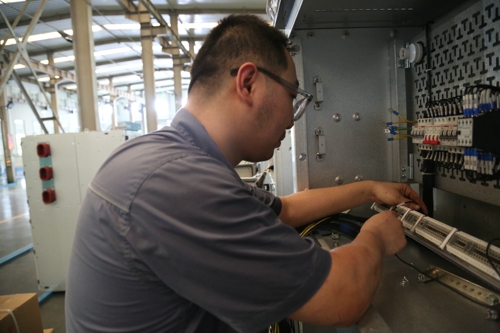 圖為自動化部員工在車間蒸騰的氣息里,完成無錫游圣變一體化電源裝配工作,這是他們的一份責任、一份堅守、一份擔當。