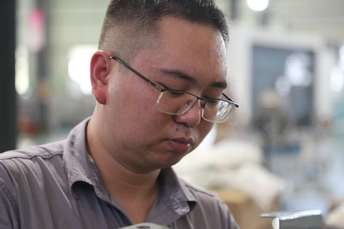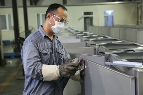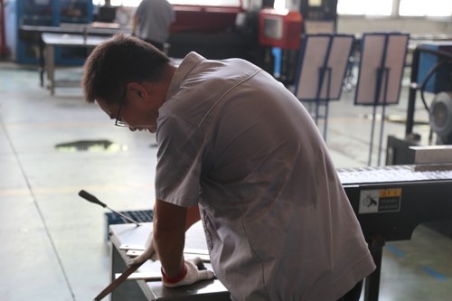 圖為高溫下的堅守者,裝配車間金工班組的員工全副武裝頂酷暑戰(zhàn)高溫,完成常州供電公司低壓電纜分支箱殼體制作工作;