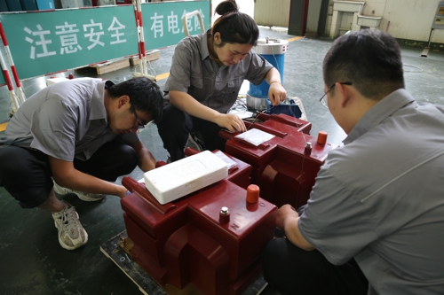 圖為卓能質量事業(yè)部質檢人員為每一件來料進行來料檢驗,對無錫本部華盛苑20kV戶內環(huán)網柜等工程共15個電壓互感器進行工頻耐壓試驗,為后續(xù)的產品質量作出保障。