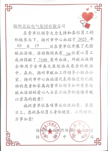 多年來(lái),北辰電氣堅(jiān)持將公益基因融入企業(yè)文化,先后獲評(píng)“江蘇省文明單位”、“揚(yáng)州市文明單位”等稱號(hào)。此次獻(xiàn)血活動(dòng)再次印證了企業(yè)“以責(zé)任鑄品牌,以熱血暖人心”的初心,積極探索更多服務(wù)社會(huì)的路徑,為構(gòu)建和諧社會(huì)貢獻(xiàn)更多北辰力量。