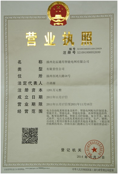北辰集團(tuán)子公司揚(yáng)州通用北辰智能電網(wǎng)工程應(yīng)用中心有限公司于2014年9月12日將公司名稱變更為揚(yáng)州北辰通用智能電網(wǎng)有限公司,并已獲得工商行政部門審批核準(zhǔn),相關(guān)執(zhí)照證書均已辦理完畢。