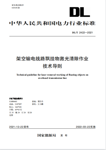 近日,公司首次參與起草的國(guó)家電力行業(yè)標(biāo)準(zhǔn)DL/T 2422—2021《架空輸電線路飄掛物激光清除作業(yè)技術(shù)導(dǎo)則》通過了國(guó)家能源局的批準(zhǔn)發(fā)布,并將于2022年3月22日正式實(shí)施。